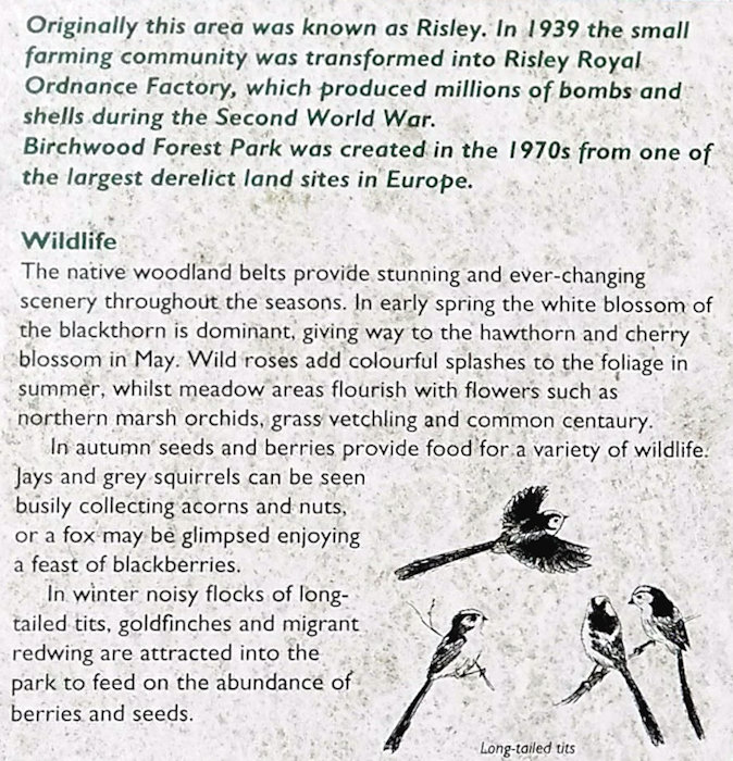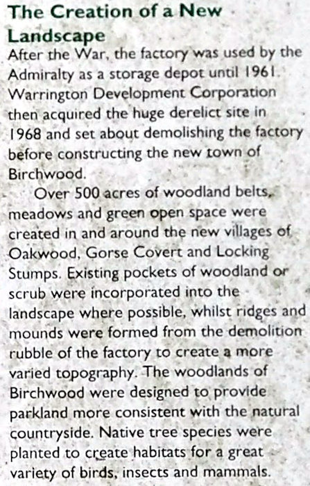 Birchwood Forest Park is a large open space for recreation and events, including the annual Birchwood Carnival. Within the grounds bunkers from ROF Risley can still be seen. They are locked up today and the grass of the park lies on top of them, although the entrances can still be seen from the pathways. Here is more information about the area from the onsite noticeboard.