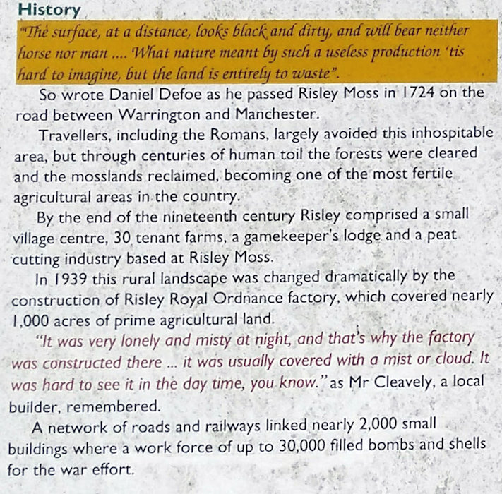 It is located on the former site of filling factory No. 6 of the Royal Ordnance Factory at Risley and is now a residential area.