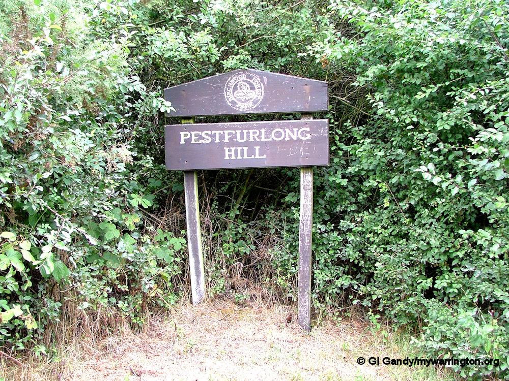Pestfurlong Hill – part of the parkland near Gorse Covert – was created out of the demolition rubble from the Royal Ordnance Factory at Risley. It forms part of Birchwood Forest Park.