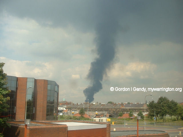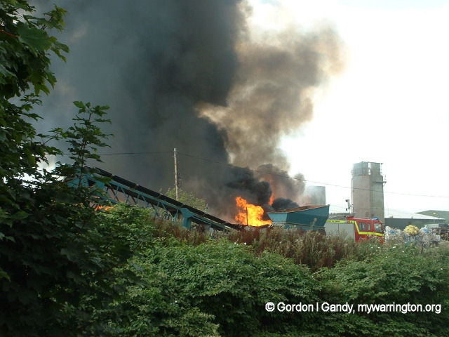 The one featured in these two photographs happened on 15 August 2003 off Hawleys Lane near Dallam. I saw the smoke from town centre (seen from Golden Square on the left). The photo (right) is as close as they would let me go. It wasn’t so much the flames, it was what was stored in the canisters in the scrapyard. And it could have gone off at any time so once the content was discovered everybody was moved back.