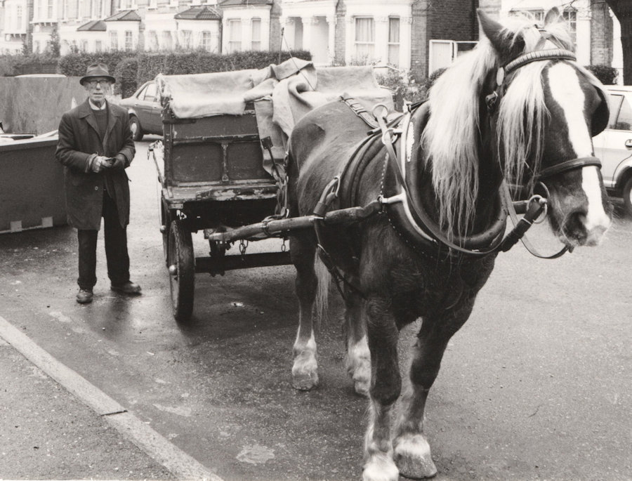 A rag-and-bone man with his horse and cart on the streets of Streatham, southwest London in 1985. Tony 1212 – Own work