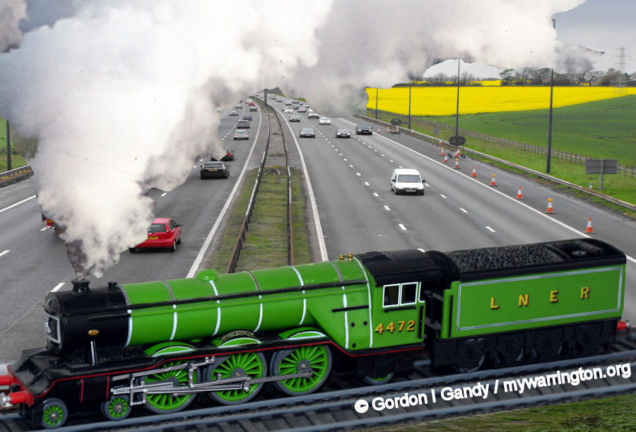 The image opposite shows what Flying Scotsman would look like if she travelled over the motorway near Croft Interchange. Of course, those with local knowledge will be quick to point out that the only railway to cross the M6 motorway at Warrington is the Northern Trains/East Midlands Railways line that runs UNDERNEATH it near Birchwood. The line that does travel through Warrington’s boundary to cross over the top of a motorway is the original Liverpool and Manchester going over the M62 at Eccles. In fact, Flying Scotsman shown here is a photograph of my personal model of the great steam engine with the motorway merged into the background and some smoke added.