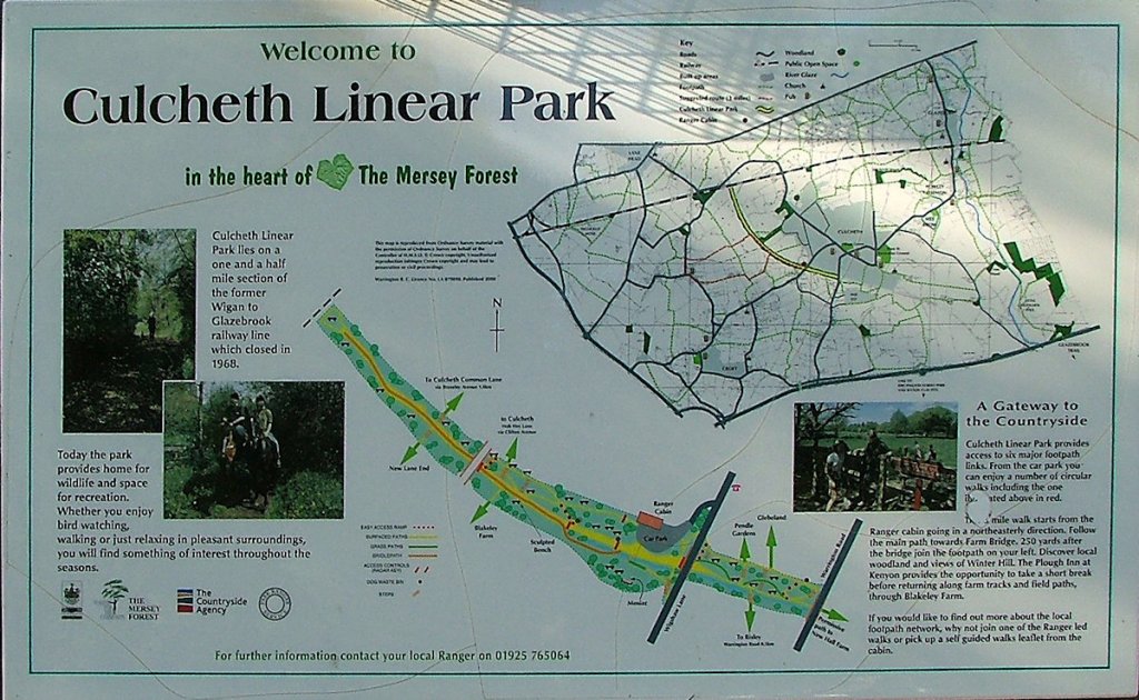 Between 1878 and 1958 there was an additional station at Glazebury on the original Liverpool and Manchester Railway route from Liverpool Lime Street to Manchester Exchange. The former trackbed of the GCR route has been turned into Culcheth Linear Park. The nearest operating train stations are now at Birchwood and Glazebrook on the line from Liverpool Lime Street to Manchester Piccadilly via Warrington Central. See Warrington Green 1 for more on Culcheth Linear Park and Making Tracks for more on railways.