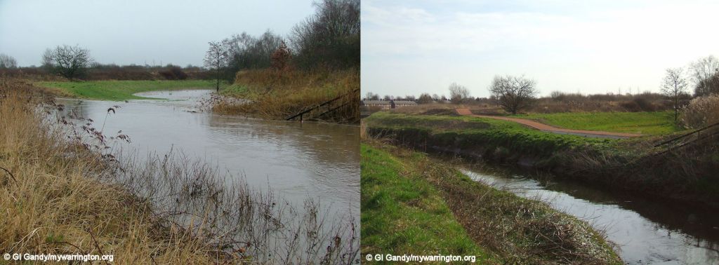 The first two photos, below, were taken on 19 January 2008. The third image is a combination of a photo taken on 19 January 2008 and the same scene on 16 March 2009 showing the water level in normal times. The Sankey Brook and Sankey Canal became one and the same in some areas between 1757 and 1963. On the Callands side we see where the Sankey Canal continued on to Widnes via Bewsey Lock, whilst the Sankey Brook continued south through to the Mersey at Penketh.