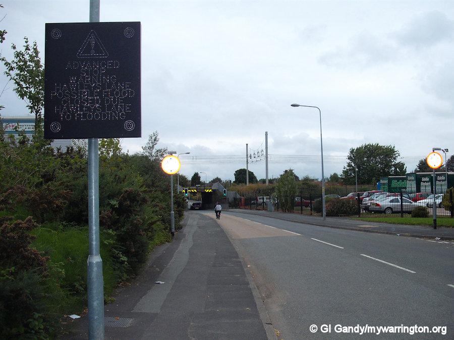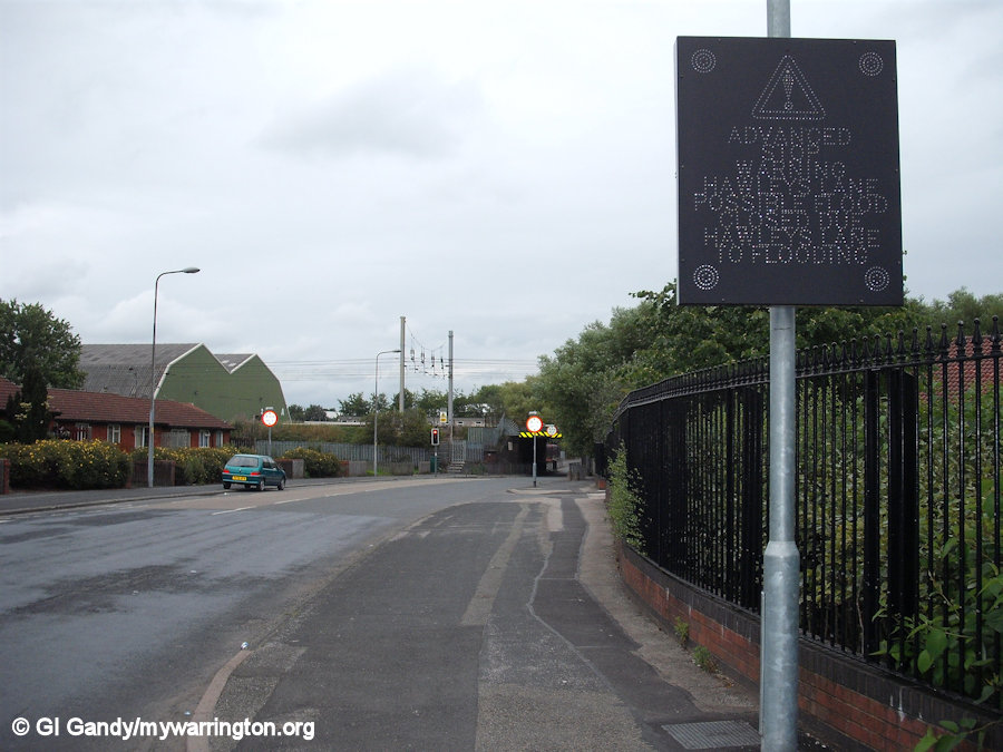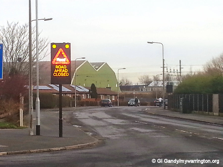 To assist vehicle owners who regularly used Hawleys Lane as part of the their journey, electronic road signs were erected to warn drivers that there was a flooding problem on Hawleys Lane (first and second images). The issue was, drivers only found out about it when they were on top of it, resulting in a reversal and redirection via Longshaw Street, Folly Lane, Kerfoot Street and Winwick Road or vice-versa. Eventually the signs were moved to the southern end of Longshaw Street and the eastern end of Hawleys Lane to give drivers fair warning. Five years later we see a ‘road closed’ sign on Hawleys Lane itself (third image).
