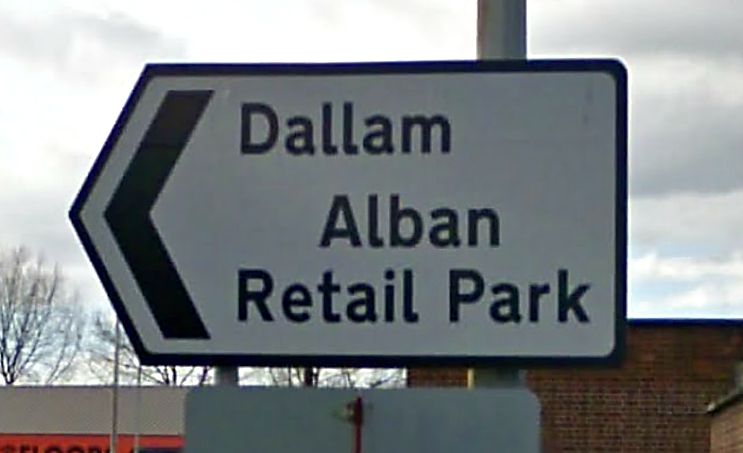 Unlike most other districts in the town, there is no official sign for the district. This is as close as we get, and even Alban Retail Park has changed its name since the sign was erected. Read more on that in the Longford section.