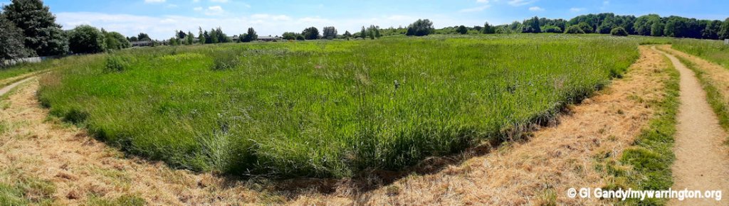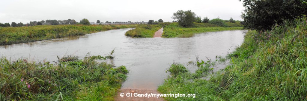 One interesting point about the third image: to prevent flooding of that area beyond the dip in the footpath, might it have been better to raise the footpath beyond the flooded area? It would seem logical to prevent that area flooding and to allow the water to continue into the Sankey Brook at Bewsey. However, there are homes and allotments further down that route, whereas the overspill area has no dwellings and is normally dry between this point and Bewsey Lock. I guess that’s why it was designed like that when they created Bewsey Meadow and the footpath from Callands to link to it. It just means you can’t get to Bewsey Meadows from Callands when it floods without going round to the west.