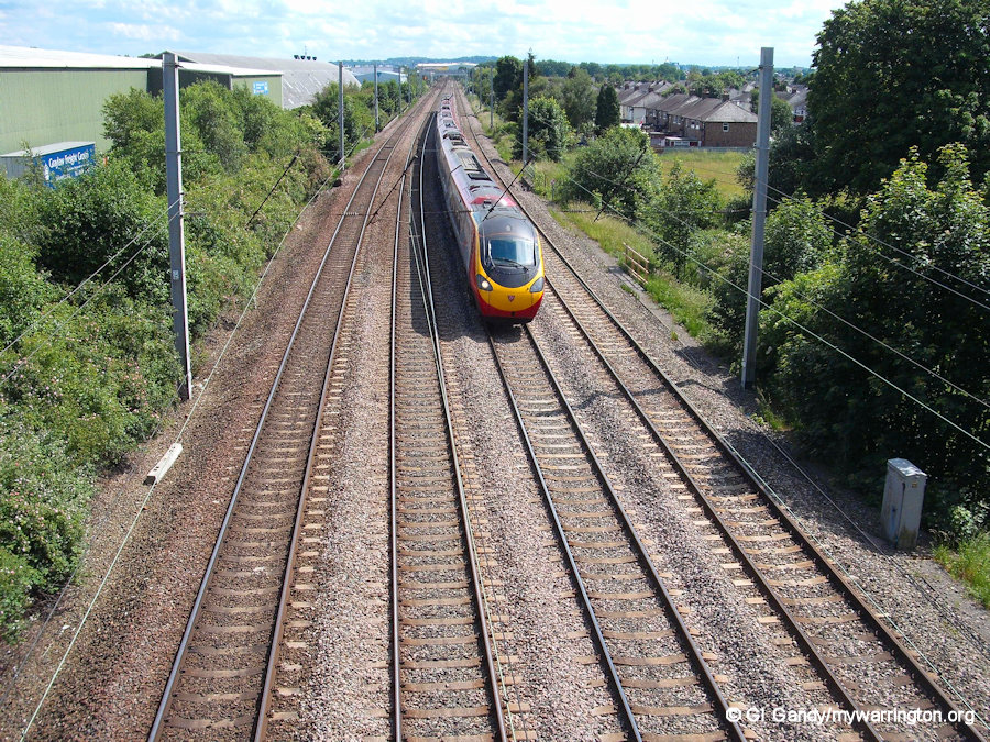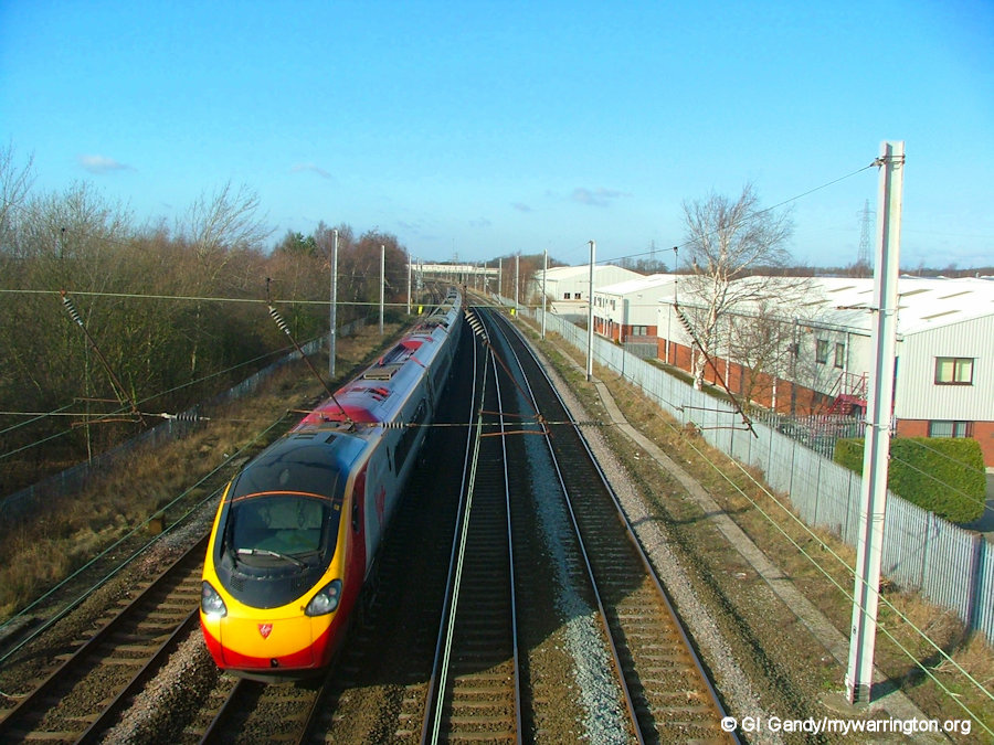 A Virgin Pendolino train travels on the West Coast Main Line through Dallam. The inside track in each direction caters for the modern trains on the route of the Warrington and Newton Railway.