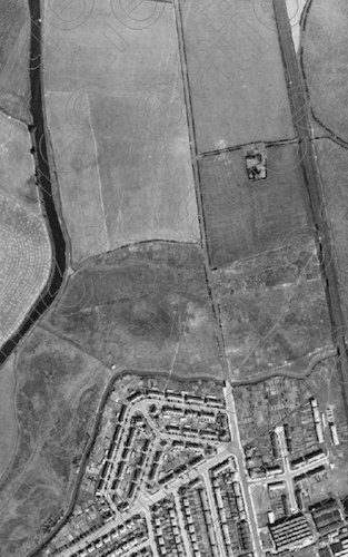 The image here shows the location of the Dallam estate from the air in the 1940s before building of the housing estate began in the 1950s. For reference, the isolated building in the open field is called Ivy Cottage and is the site of a residential home today on Hawleys Lane.