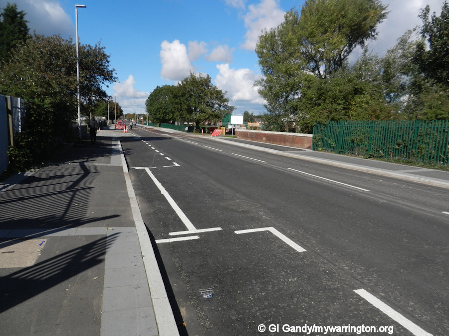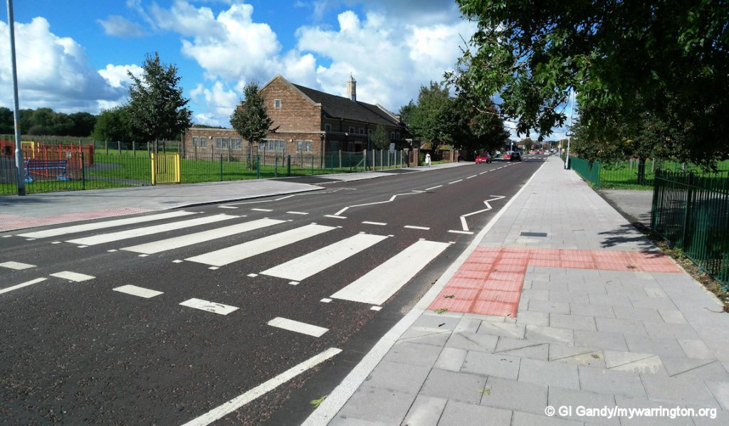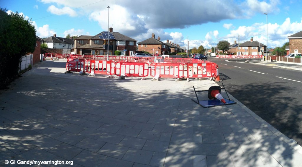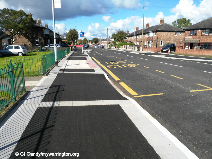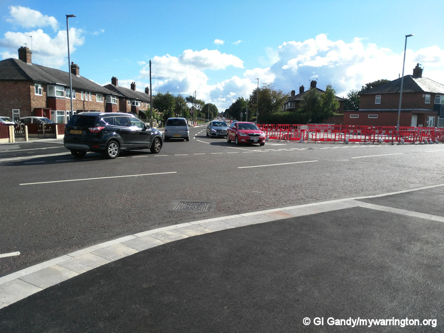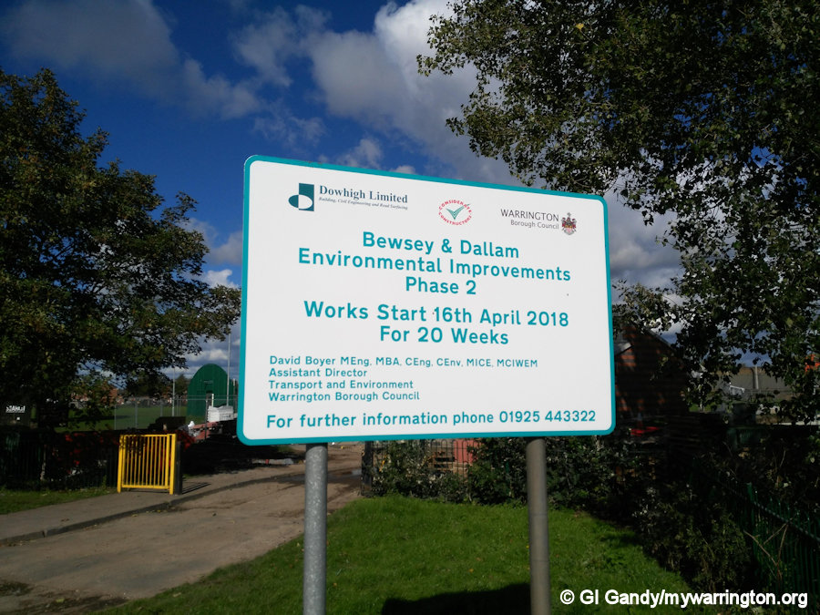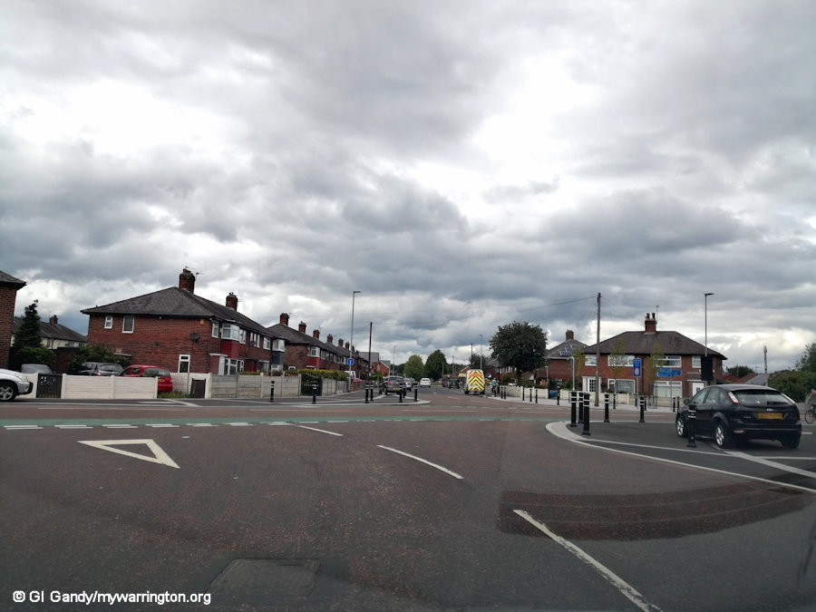 Grey to Green was a road and pavement improvement scheme for Bewsey and Dallam. The Bewsey section was completed in 2016 and the Dallam section in 2018. The work involved new pedestrian crossings, road markings, new pavements and parking spaces. The project also including a change of priority at the junction of Longshaw Street and Hawleys Lane. In times past, residents had complained about vehicles leaving Hawleys Lane at speed to travel down to Bewsey, thus putting pedestrians at risk from irresponsible and selfish drivers and motorcyclists. So the improvement meant that Longshaw Street was no longer the priority, instead Hawleys Lane would be. Pavements were widening at the junction and Longshaw Street traffic now has to give way. If any rider or driver now turned onto Longshaw Street at speed they are likely to crash their own vehicle due to the sharp angle they now must observe.