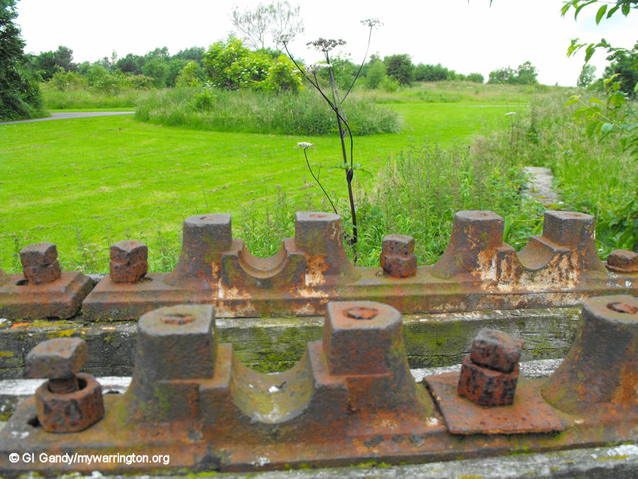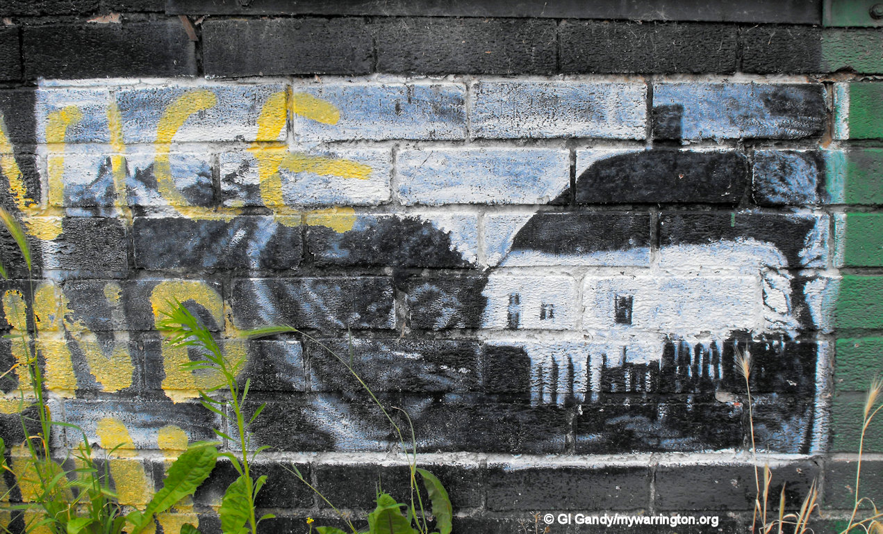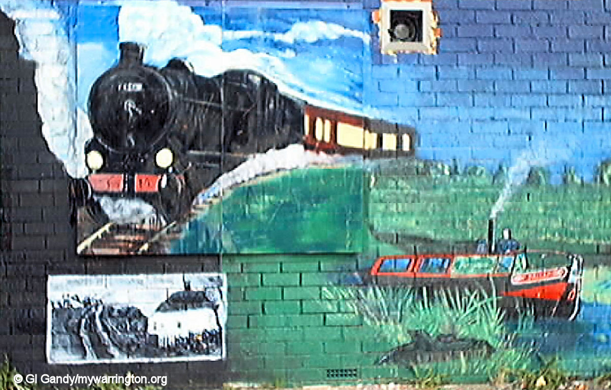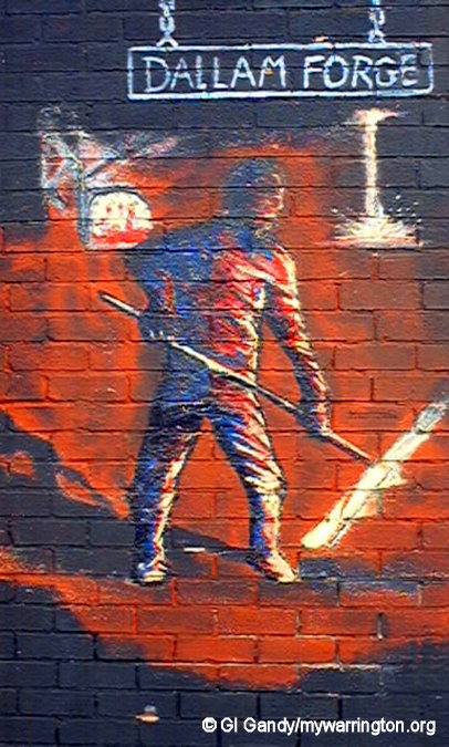 Another industrial site in the town was Dallam Forge. Although outside the district (it is located on Dallam Lane in Bewsey) it is remembered here in the artwork. Dallam Forge opened in Dallam Lane in 1840 as a supplier of merchant Iron. Next came the railway as featured in the Warrington and Newton Railway of 1831, a branch of the Liverpool and Manchester Railway which opened the year before.