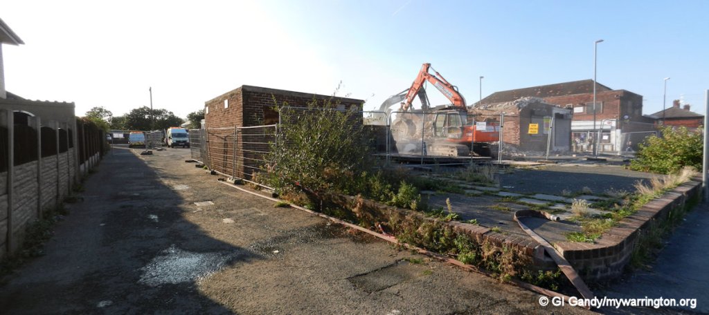After the shops on the south side of Harrison had long been vacated, the former post office and Beswick’s grocers shop were merged into one large space to accommodate a gymnasium and the Studio 4 Dance group. As the group didn’t need to use the back yards (apart from emergency exits) it was agreed to demolish the yards to make way for much need car parking space during the school run. Boulting Avenue was getting congested, affecting delivery vehicles visiting the school. Of course, yours truly was there to record the demolition for prosperity. The first three photos show the demolition on 7 October 2002. The remaining images show the car parking space as it looked for the next twelve years.