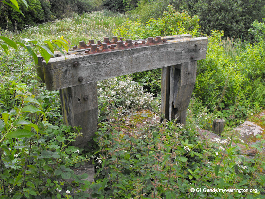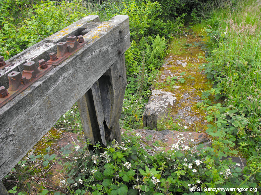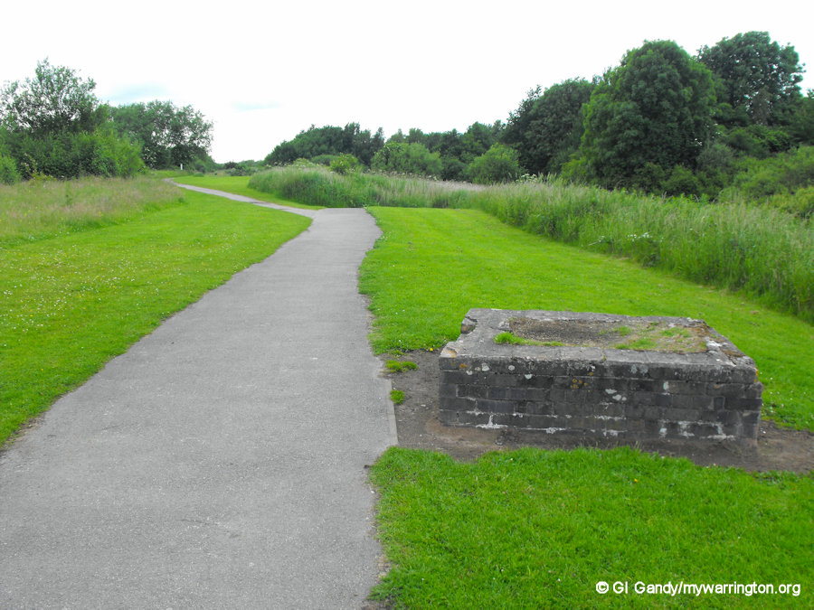 The Sankey Canal, also known as the Sankey Brook Navigation and the St Helens Canal, was opened in 1757 and passed alongside Dallam on its way from St Helens to Spike Island at Widnes. I cover the story of the Sankey Canal in more detail in On the Waterfront and in Warrington Green, but what I wish to show you here in pictures are the remains of the sluice gates used for drainage at Dallam. They are located north of Stanners Pool, which we will cover shortly. The photos were taken on 27 June 2012 and the site has been left to nature, so it might be difficult seeing the sluice gates. But they can be located because the brick feature is alongside the footpath (turn to the right as we look and tread carefully! mywarrington is not responsible for your health and safety).