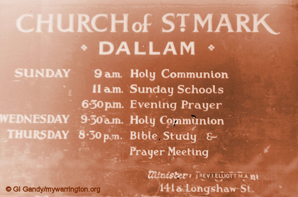 The foundation stone for St Mark’s is dated 31 October 1953, but the church held its services in Dallam Primary School until the church building was ready. After the retirement of Rev Marshall in 2017 the Church of England leased the building to the Oasis fellowship and it became known as St Mark’s Oasis Warrington. It has since been known as Urban church and is currently part of King’s Church. You might find this website useful for information about earlier times of the church.