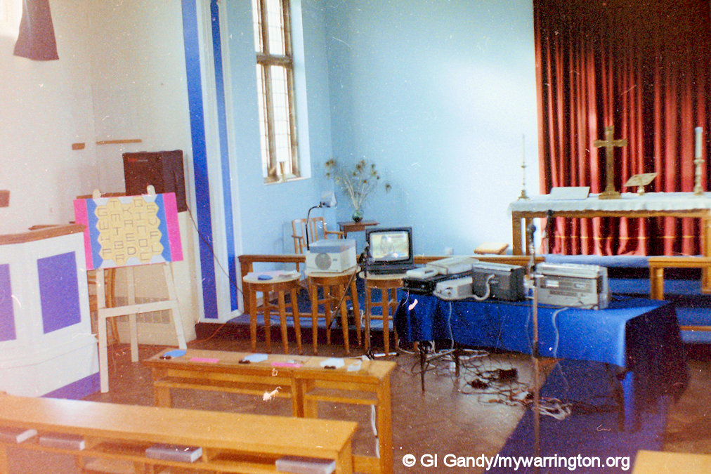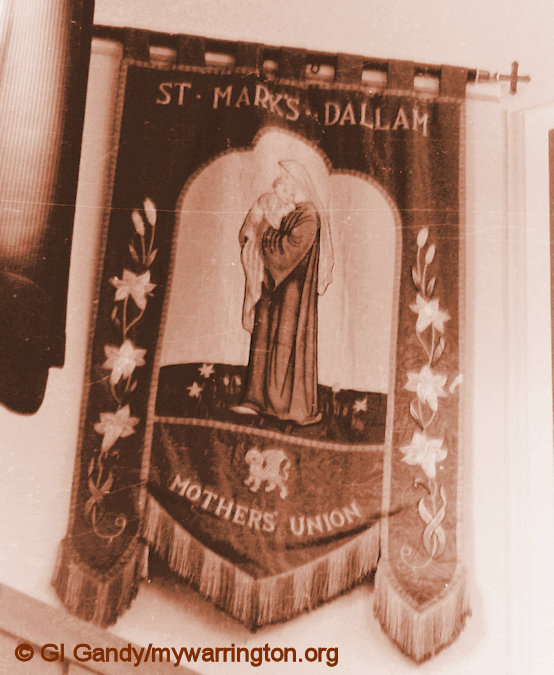 The banner, left, was about 10ft by 6ft and was mounted on wheels for the annual Warrington Walking Day and Parish Walks. The Parish Walk was an annual custom whereby the church walked around the estates in the church’s catchment area of Dallam and Bewsey on the second Sunday after Walking Day. The walk alternated between Dallam one year and Bewsey the next, with an open-air church service at the end if it was dry. If not, inside the church.