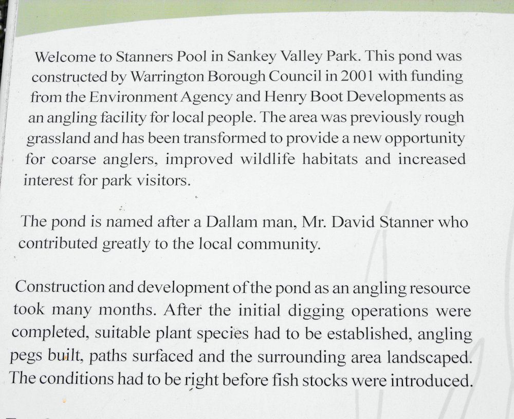 Dave Stanner was a much loved member of the community in Dallam and his early death in 2001 prompted residents to find a way to remember him. He loved fishing and so the idea for a fishing pool was suggested. Before then the only fishing pond in the area was Shaky’s Pit which had long seen better days. Parts of it still exist on the edge of Callands close to the Sankey Canal. You can read more about Stanners Pool in the photos below.