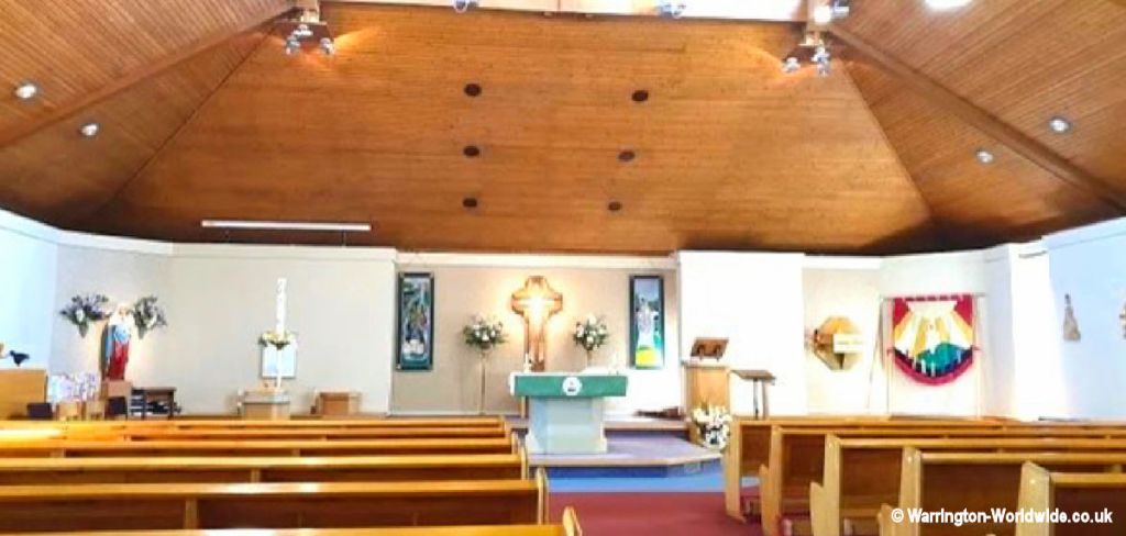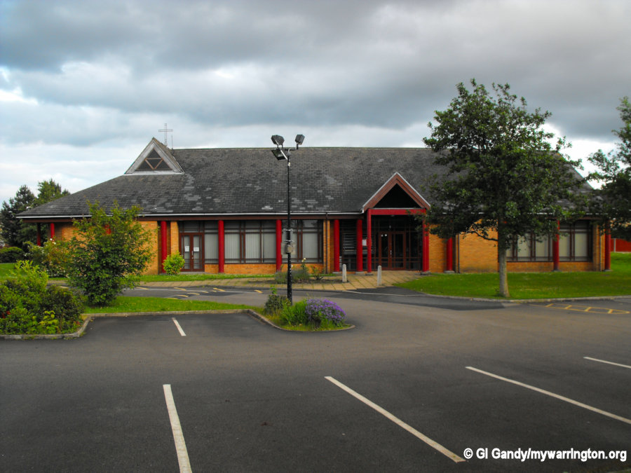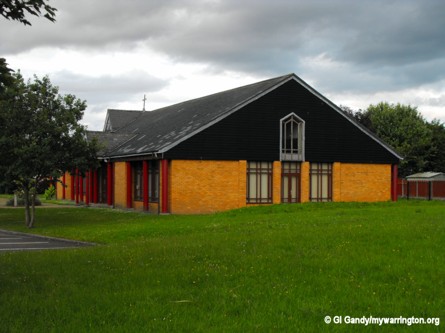 The church building is of a modern design and was built to serve a growing population in the area as a result of the Warrington New Town during the late 1960s. It is rectangular in plan, built of buff-coloured brick with a pitched and slated roof brought down onto metal columns.