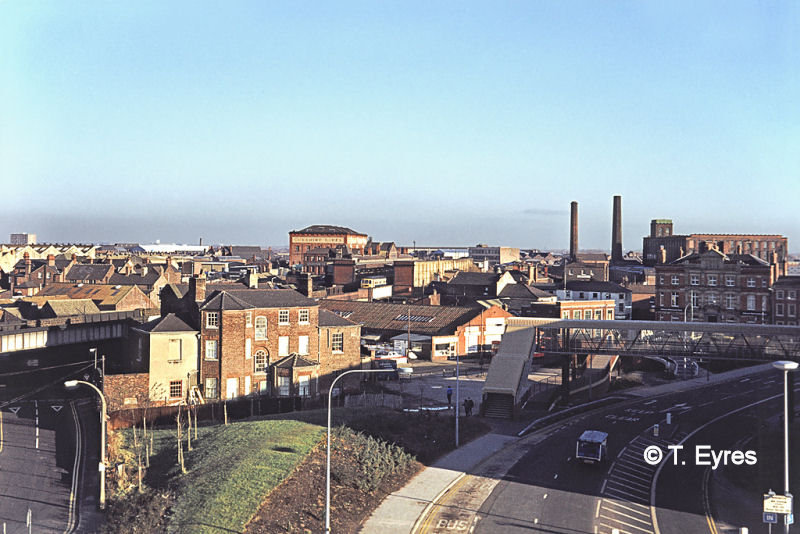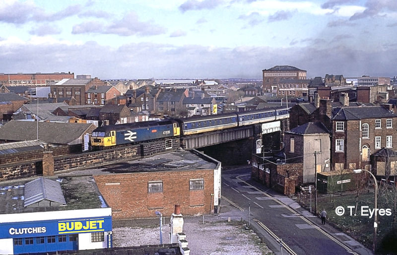 Here we see 47371, a no heat freight loco working 16.45 Liverpool – Sheffield on Saturday 13 June 1987. It crosses over Allen Street bridge passing the Blue Back pub. The pub was demolished when Midland Way was built in 1996.