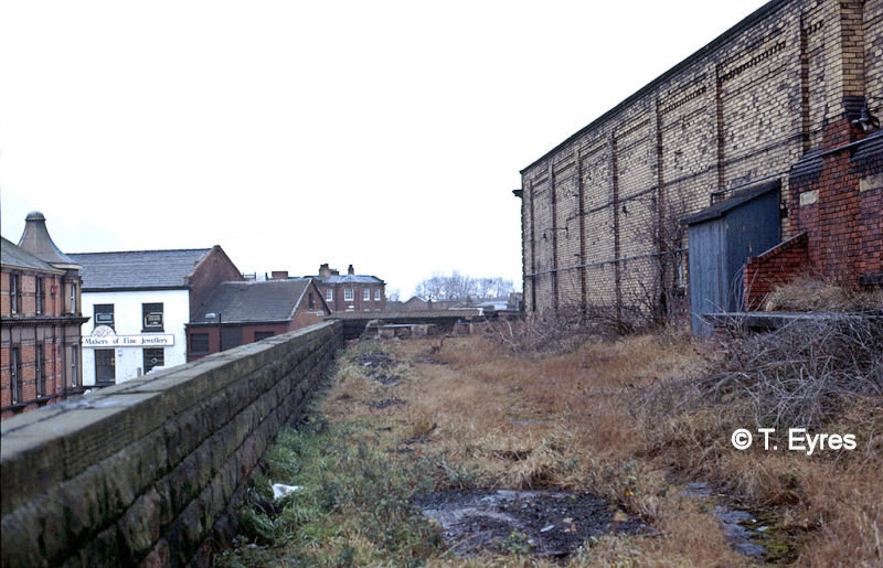 This is a view looking west on Boxing Day 1986 showing the remains of the stabling point alongside Warrington Central Station, a sub shed of Liverpool Brunswick shed. There with two concrete stop blocks at the Horsemarket Street end. It was in use until 1966, outliving Brunswick. Crown Street is to the left. I remember an amusement arcade in the white building on the left. It is where I first played the Space Invaders game, but I was never any good at it. I preferred the Breakout brick game.