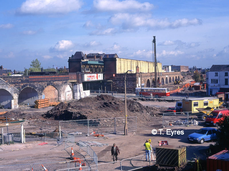 This next view shows the construction of Midland Way, which was built over the arches alongside the station building. Terry says he will always remember walking down Winwick Street as a kid looking up at a few 4F’s and Stanier/Fairburn 2.6.4 tanks, a very strange sight from ground level. Midland Way is now the route of the A57 through-road. The area in the foreground is now the location of Warrington Interchange, the bus station. The photo was taken in 1995 or 1996.