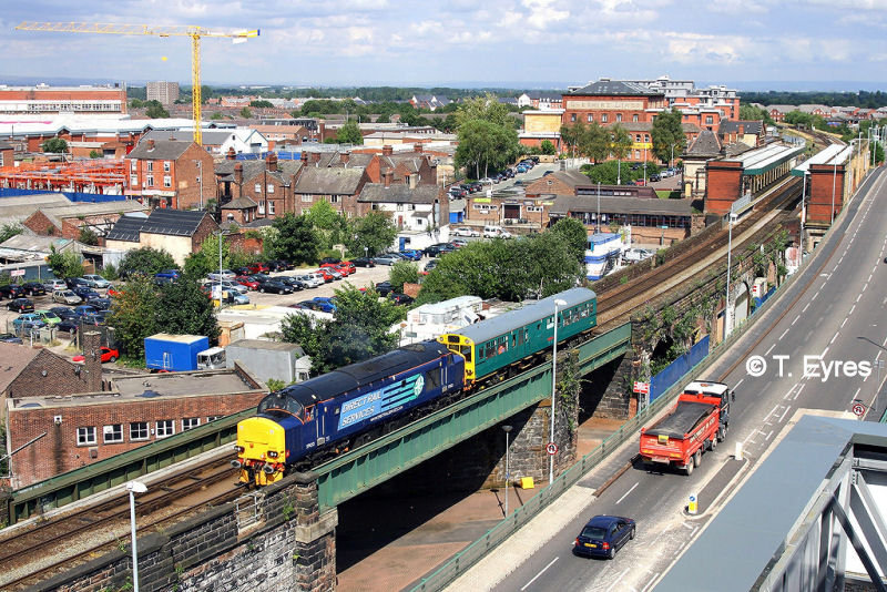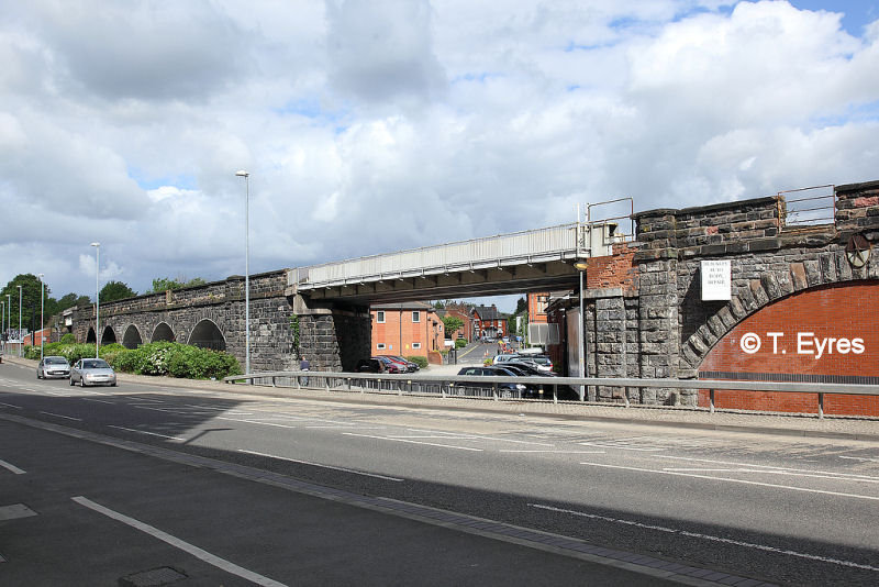 This is the modern view of the area taken in 2008. Midland Way is on the right. The train is unusual. It isn’t often you see just one carriage. The surrounding streets and Budget Tyres & Clutches have all been swept away. St Alban’s Social Club to the left of the train has now been demolished.
