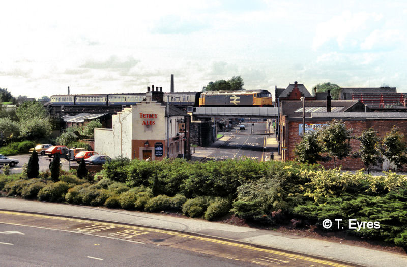 This next shot moves to the left of the previous view and shows diesel locomotive 47 835 crossing over Bewsey Street as it leaves Warrington Central for Liverpool. The street here is Brown Street, and the building on the right was where the Warrington Observer newspaper was based. The photo was taken in 1991.