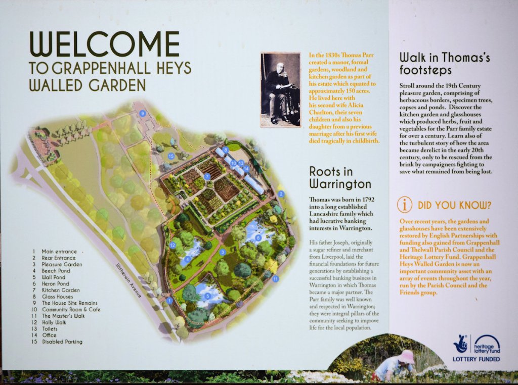 The walled garden was built around 1830 by Warrington banker Thomas Parr to accompany a mansion house. Thomas Parr’s father, Joseph Parr, founded Parr’s Bank and Thomas was appointed Chairman of the bank. Before opening the bank, Joseph Parr had made his wealth in the sugar refining industry that supported the slave trade in the British West Indies. Parr’s bank amalgamated through acquisitions into the NatWest of today.