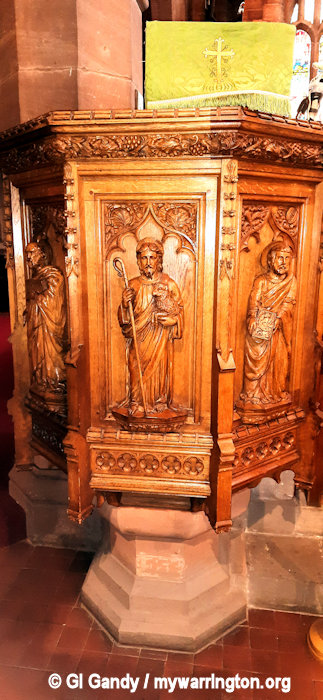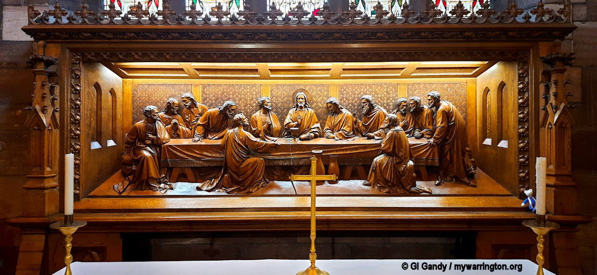 The reredos is carved in oak and is based on the painting of The Last Supper by Leonardo da Vinci. The font dates from the Norman era, or earlier, and was rediscovered in March 1873 during the restoration of the church.