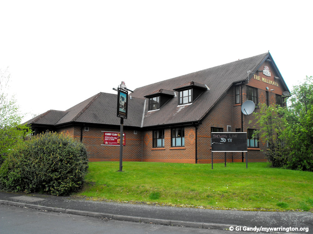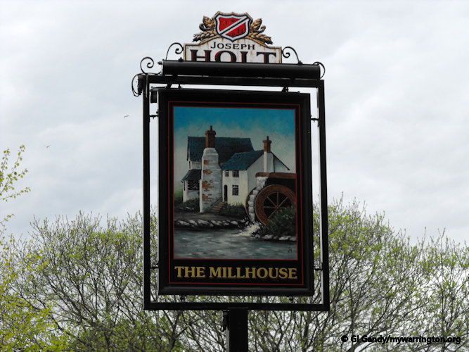 The Milhouse pub is built on land close to the site of Houghton Mill. In the area, and viewable on the OS six inch map of 1888-1915, are the mill (which is already out of use at that time), Mill Cottages, Houghton Mill Bridge and Mill Brook, which runs into Black Brook past Black Brook Farm near Cinnamon Brow and into Blackbrook alongside Orford.