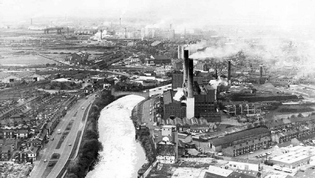 A view of the Howley industrial area showing the electricity generating station in the centre alongside the river Mersey.