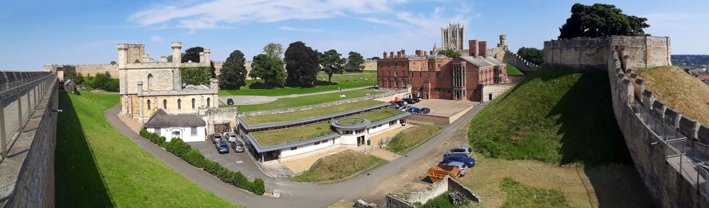 The image here shows Lincoln Castle from my visit on 31 July 2024. It is a motte and bailey type, the style that graced Mote Hill in Warrington in the 13th century. The motte (or mount) is on the right and the bailey enclosure is bound by the castle wall. The building in white and cream on the left is a working courthouse and therefore not open to the public as a visitor attraction. For more on Lincoln Castle, see their website.