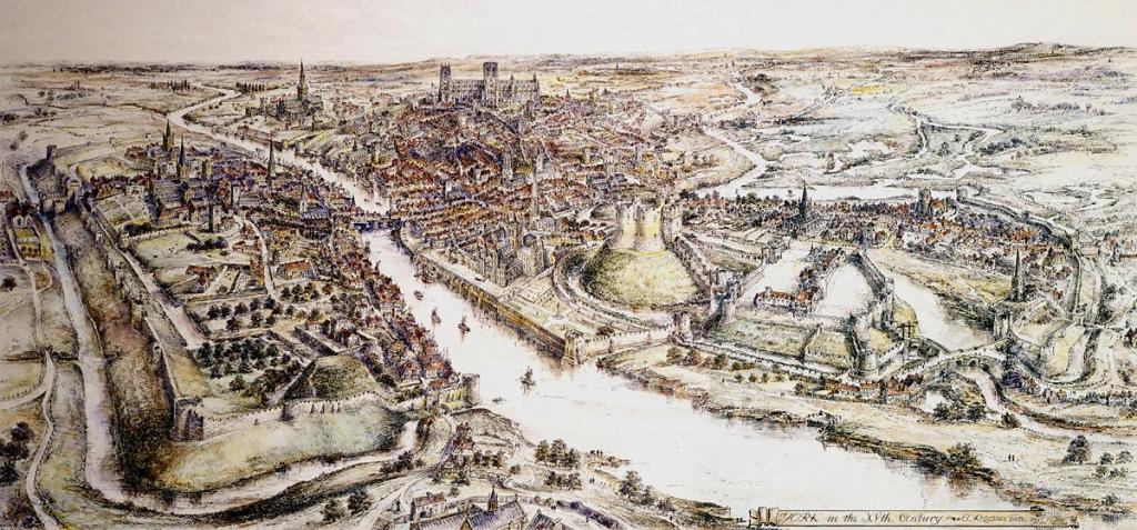 A panoramic view of York in the 15th century. A watercolour by E. Ridsdale Tate produced in 1914, the earliest publication I have found it in is Edwin Benson’s 1920 volume “Life in a Mediæval City”, published in London. A reconstruction of the English city of York in the 15th century, showing the motte-and-bailey fortifications of Old Baile (left foreground) and York Castle topped by Clifford’s Tower (centre right). The castle would have been in a similar style to ours at Warrington. This work is in the public domain in its country of origin and other countries and areas where the copyright term is the author’s life plus 70 years or fewer. See commons.wikimedia.org
