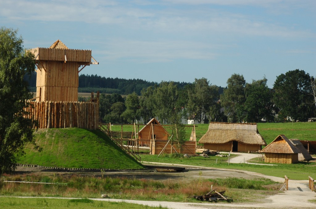 The Slavic early medieval settlement in the Bärnau-Tachov History Park with the motte in the foreground (translated from German). This file is licensed under the Creative Commons Attribution-Share Alike 3.0 Unported license by Barbara Brunner. See Wikimedia.org