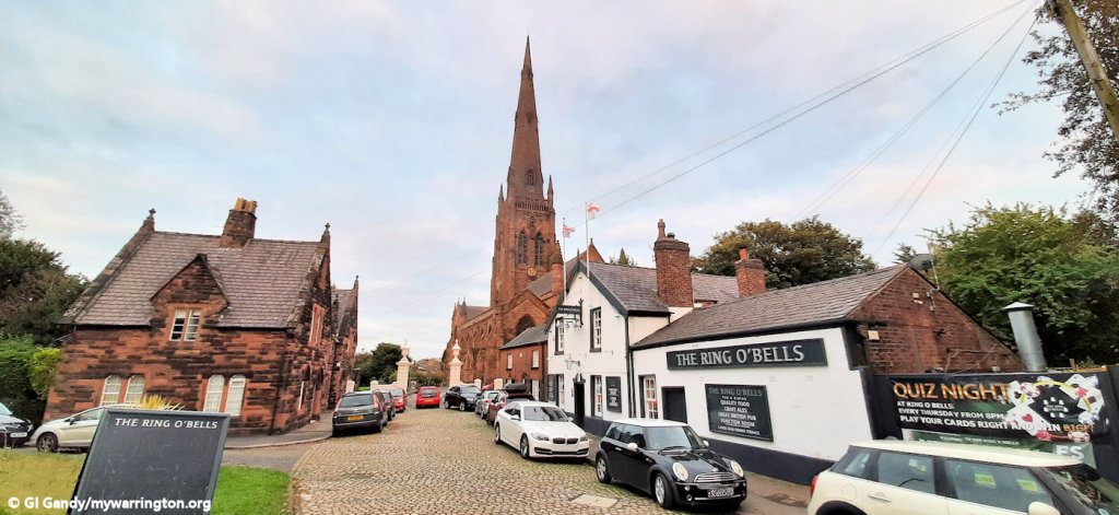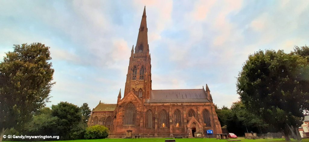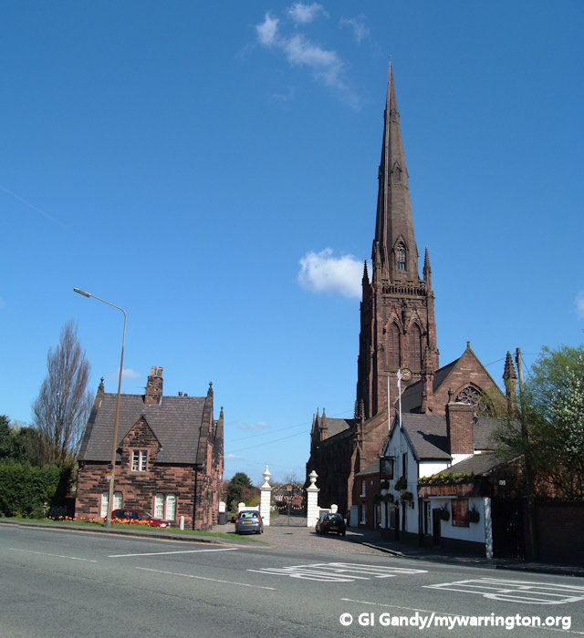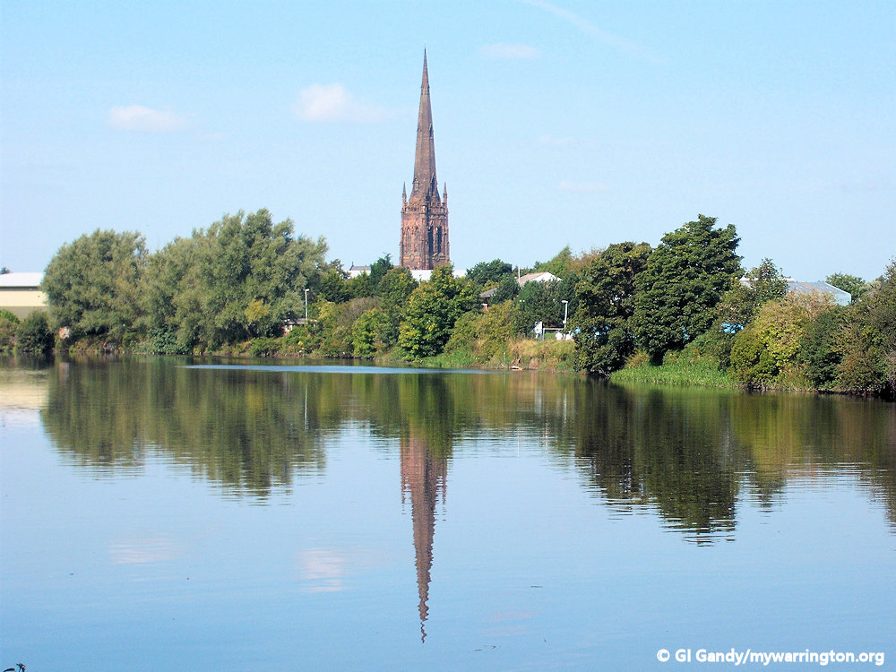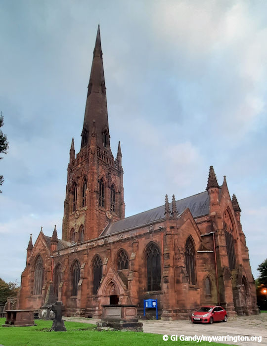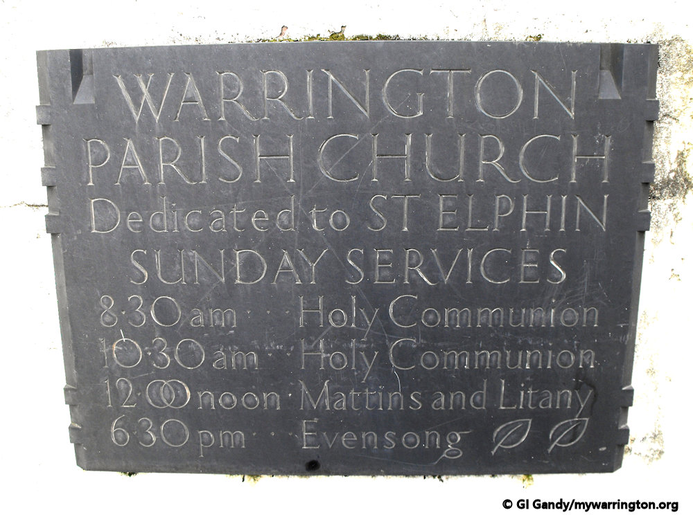 The Parish Church of St Elphin (or simply the Parish Church, as it is known locally) was founded in 642 AD and built out of wood alongside the north to south Roman road, which crossed the Mersey at this point. It was later rebuilt and enlarged in the 19th century. The church is dominated by its 281 feet (86 m) high spire.
