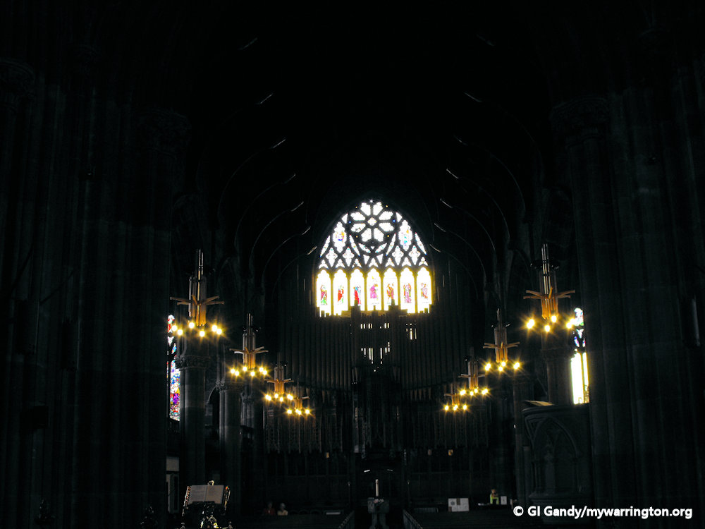 It was rebuilt in 1946 – for about £6,000 – by the Liverpool firm of Rushworth & Draper Ltd. when the organ was re-arranged with part being placed on a gallery at the west end, while the rest remained only on the gallery in the south transept. This fine three manual and pedal instrument is no longer used. Instead, in November 2005 an electronic organ of twenty audio channels and 61 stops – also with three manuals and pedal – was provided by the Darwen (Lancashire) firm of Phoenix Organs.