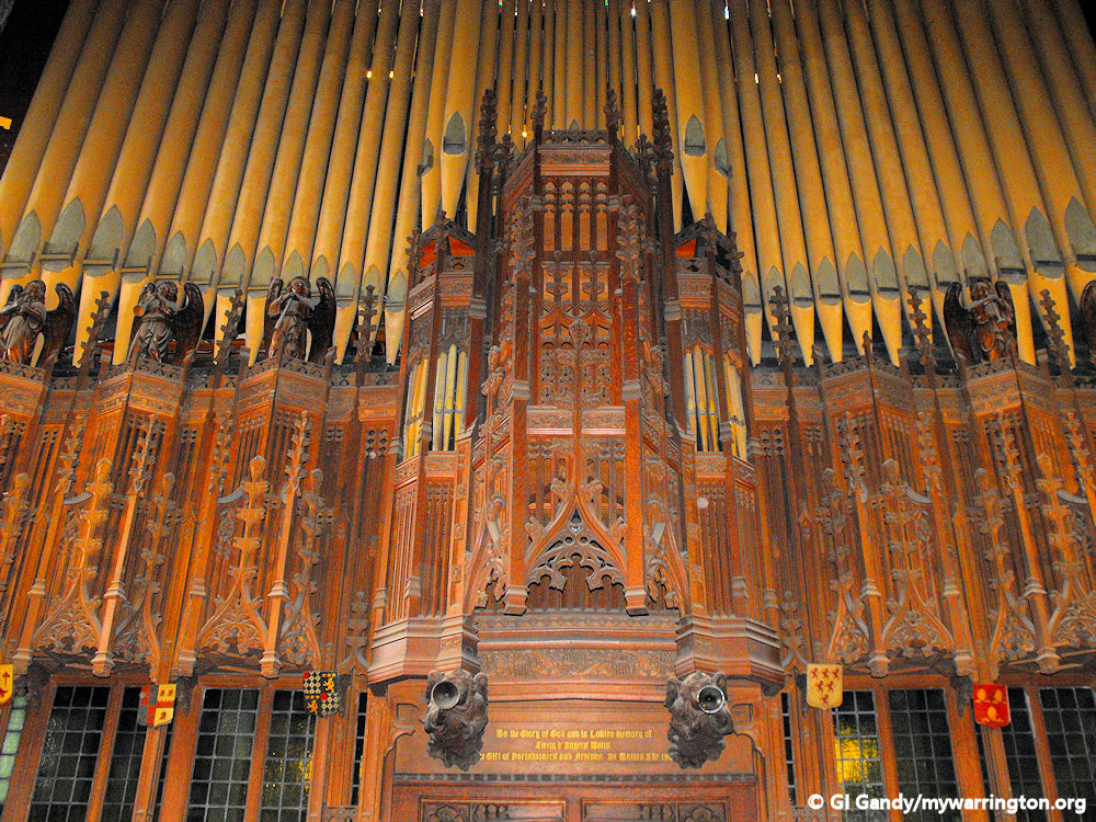 A pipe organ was installed in 1876 by the London firm of Gray & Davison at a cost of £1,296. Additions were made by the same firm in 1881. It was rebuilt in 1902 by the Manchester firm of Alexander Young and Sons. At this stage the organ was divided in two, placed on galleries over the north and south transepts.