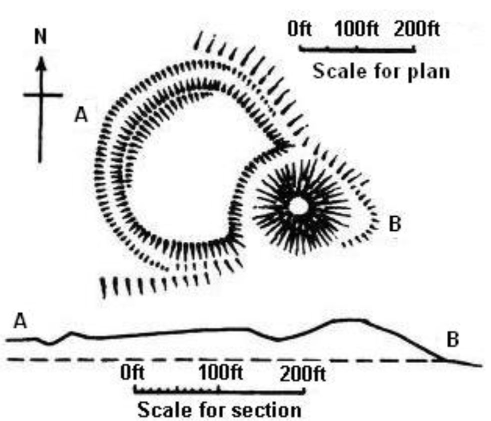 The mound was excavated in 1832. On its top was a circular depression, c.1. foot deep, filled with carbonized reeds, straw and brushwood mixed with bones and decayed animal refuse. A pit of concial form contained ashes and burnt bones.