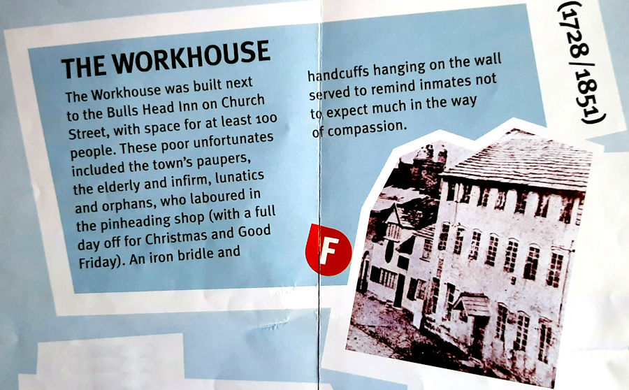 A workhouse was institution to provide employment for paupers and sustenance for the infirm. They were founded in England from the 17th through the 19th century and also in such countries as the Netherlands and in colonial America. Warrington had two workhouses. The first was opened on Church Street next to the Bulls Head pub in 1728. It had space for 100 inmates and operated under strict rules which included no alcohol, spitting or filth or swearing. There was also a ban on books and other publications with an ‘immoral tendency’. The Church Street workhouse was closed in 1851. A second workhouse was located in what is now Warrington Hospital. This will be discussed in the Whitecross section of Downtown.