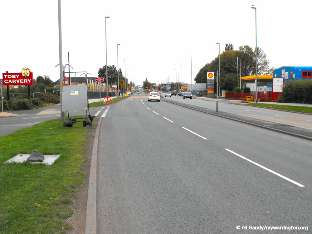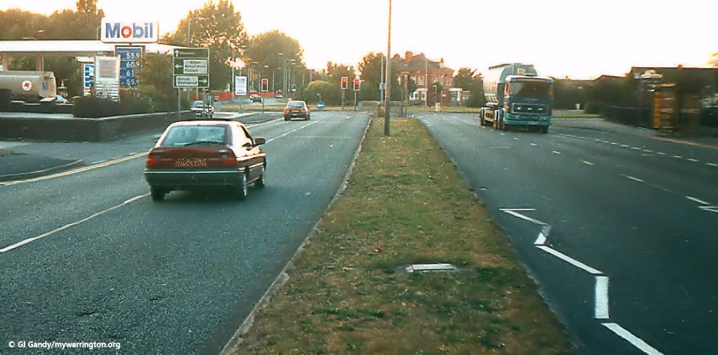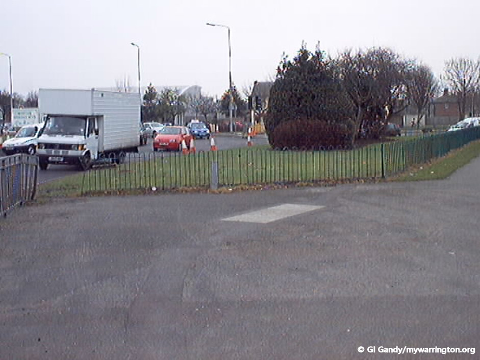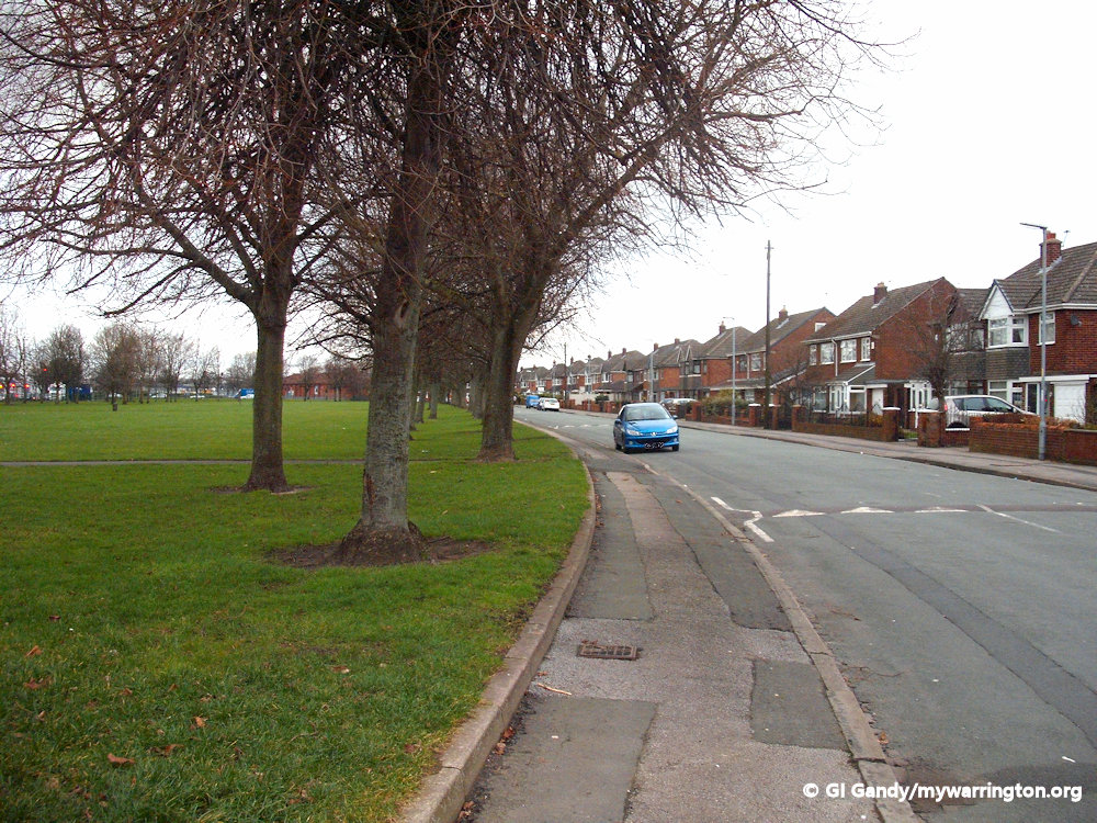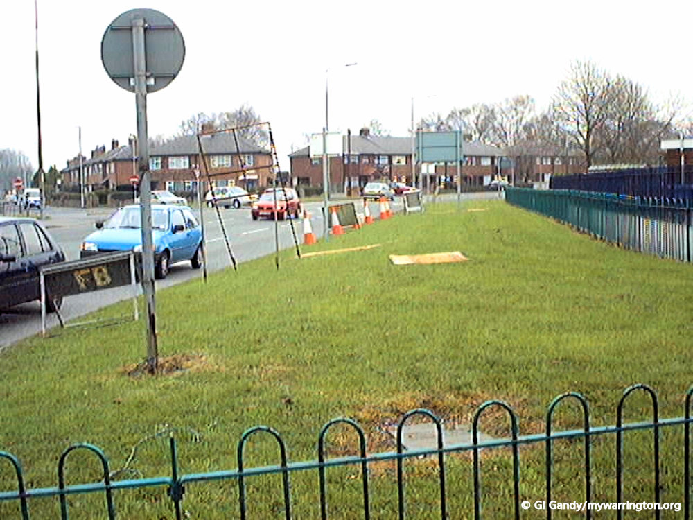 The original section of Winwick Road used by vehicles before the dual carriageway was built on the opposite side of Longford Park to the left as we look.