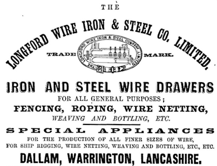 Although based in Bewsey, the company was known as Longford Wire. It was located immediately south of the gas works. The company was founded in 1874, as an advert from that year declares: ‘A WARRINGTON WIRE IRON AND STEEL COMPANY’. A Manchester contemporary publishes the following: “The following company has been recently registered: LONGFORD WIRE, IRON, AND STEEL”.