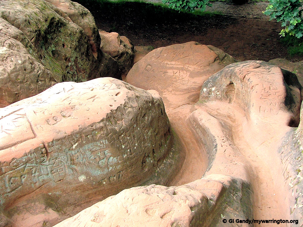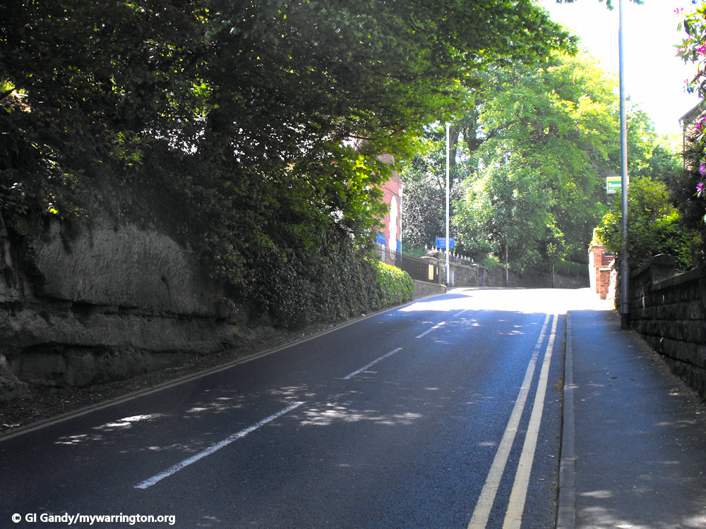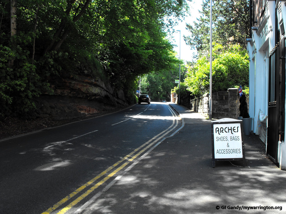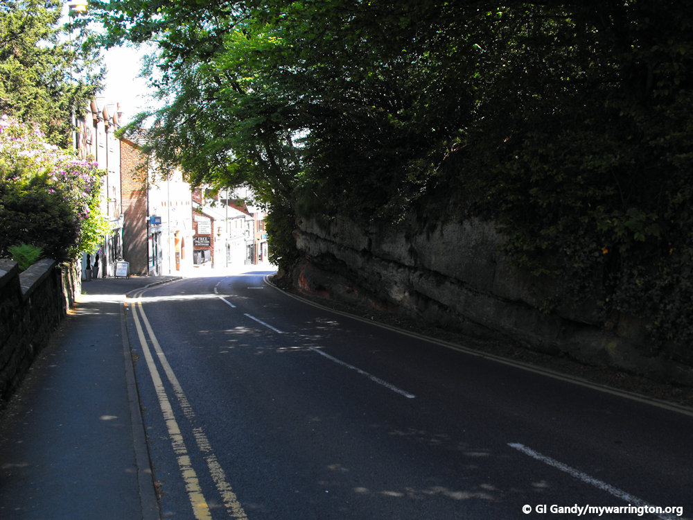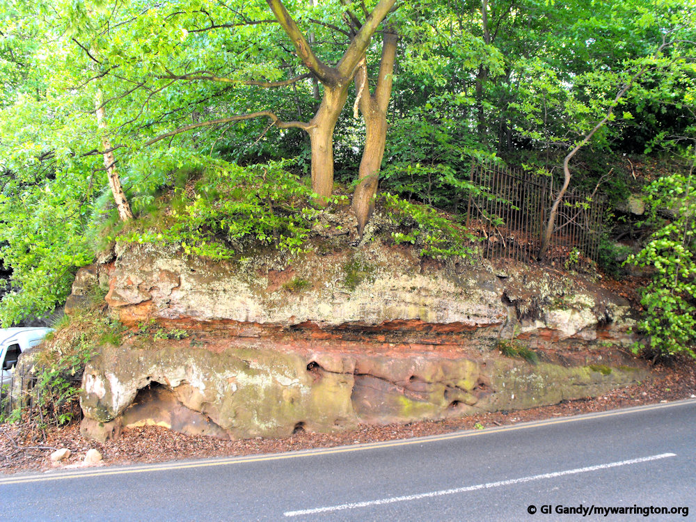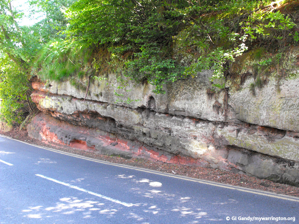 The Helsby sandstone, which has more of a red tone than the underlying Wilmslow formation, continues southward through the village centre, the Dingle and roughly halfway along Lymm Dam.