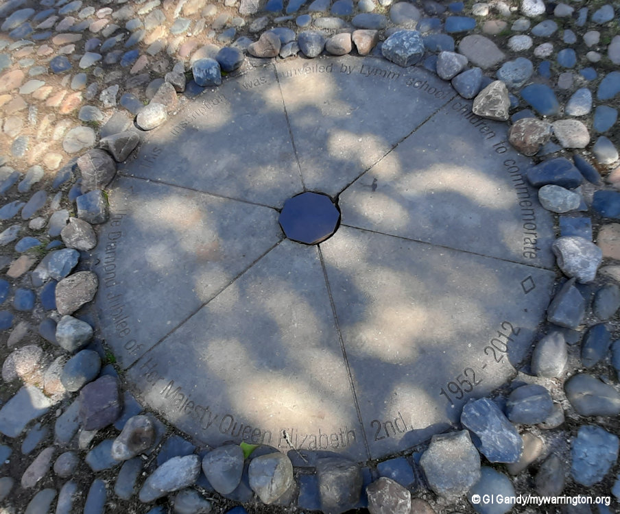 The wording on the memorial above reads: This inscription was unveiled by Lymm School Children to Commemorate the Diamond Jubilee of her Majesty Queen Elizabeth 2nd, 1952 – 2012.