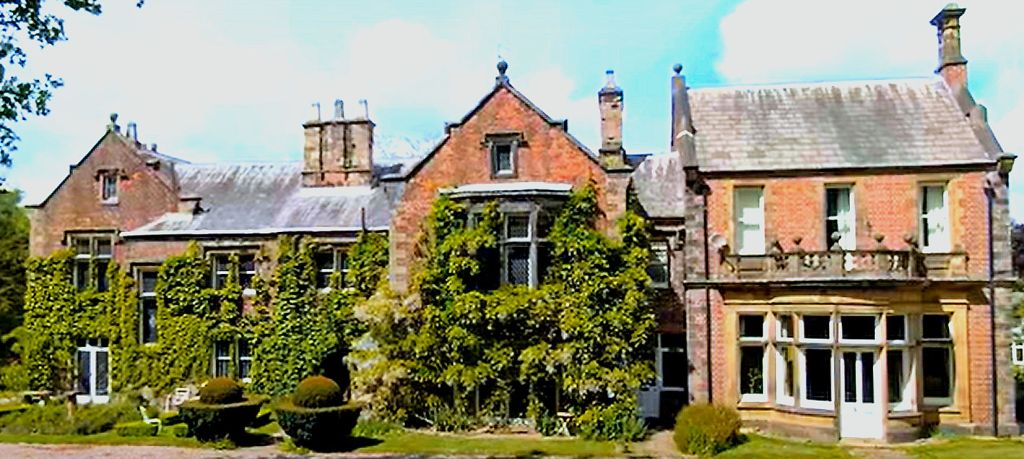 It is an ancient low building of stone, venerably grey with lichens, seated within the remains of a moat, on an eminence above the village, commanding an extensive view into Lancashire. The old bay windows, enriched by the late proprietor with ancient stained glass, are preserved in the entrance-hall, which is an interesting apartment, surrounded with family pictures. Soon afterwards many modern improvements were made in the building and it was enlarged and its ancient moat was entirely filled up.