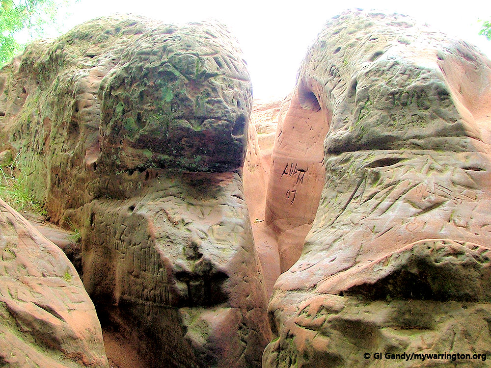 The rock in Slitten Gorge is known as Wilmslow Sandstone. As you climb the steps to Whitbarrow Road at the southern end of Slitten Gorge you pass into Helsby sandstone, which overlies the Wilmslow sandstone.
