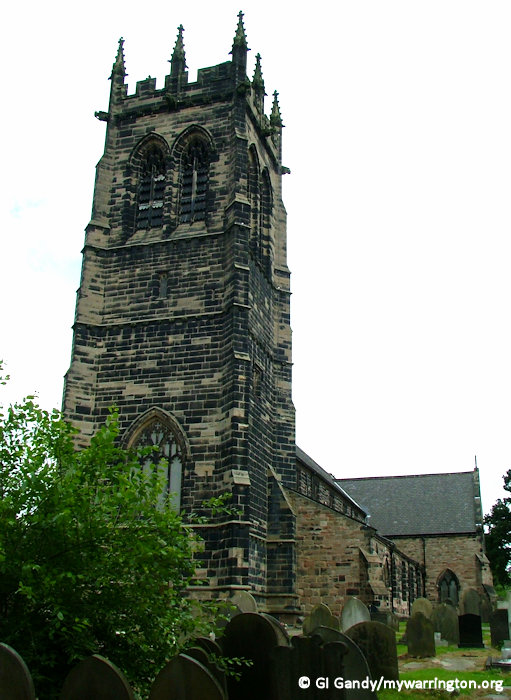 * Patron of the first, E. Leigh, Esq.; of the second, R. E. E. Warburton, Esq. The old church dated from about 1322; and, except the W[est] window and the lower part of the tower, was taken down in 1850. The new church was built in 1851; is in the early decorated style; comprises nave, aisles, transepts, and chancel, with a tower; has a fine E[ast] window, put up in 1865 in memory of the late rector, the Rev. W. M’Iver; and includes, in the N[orth] aisle, a private chapel in lieu of one in the old church. Two chapels of ease are in Oughtrington and Broomedge. An Independent chapel was built, in 1863, at a cost of about £3,200. There are also chapels for Baptists, Wesleyans, and Primitive Methodists, an endowed grammar school, parochial schools, a mixed school, an infant school, and charities £95.—The sub-district contains also Warburton parish, and parts of three other parishes. Acres, 18,170. Pop., 7,395. Houses, 1,398.