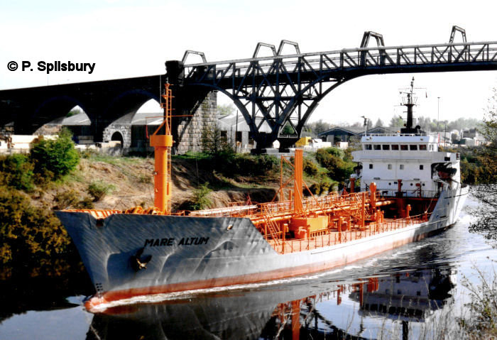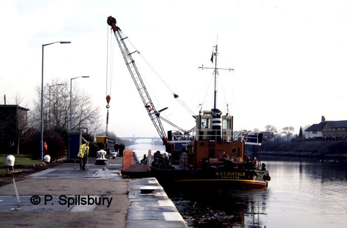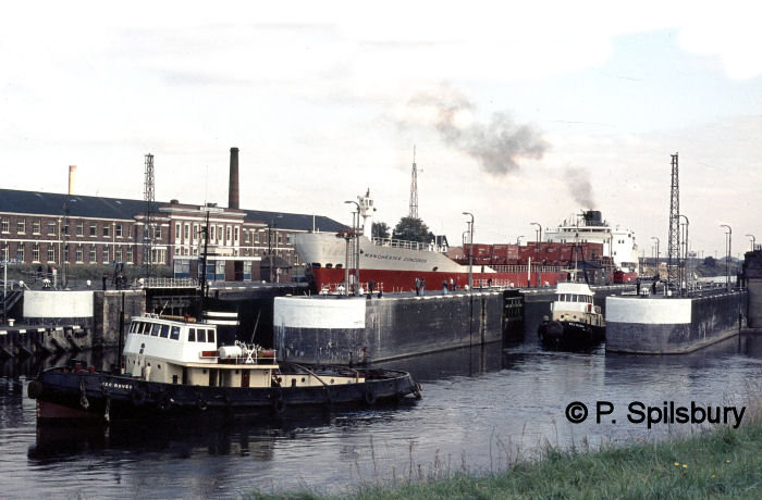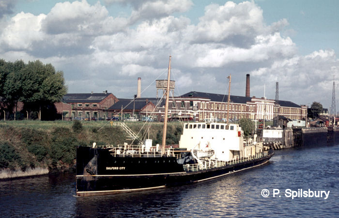 Manchester’s sewage was treated at Barton and shipped out to the Mersey Bar by a number of vessels over the years until a new treatment plant was constructed at Waterloo Dock, Liverpool by North West Water (later United Utilities). Salford City is seen here at Latchford Locks with Richmonds factory behind. Photo © P Spilsbury