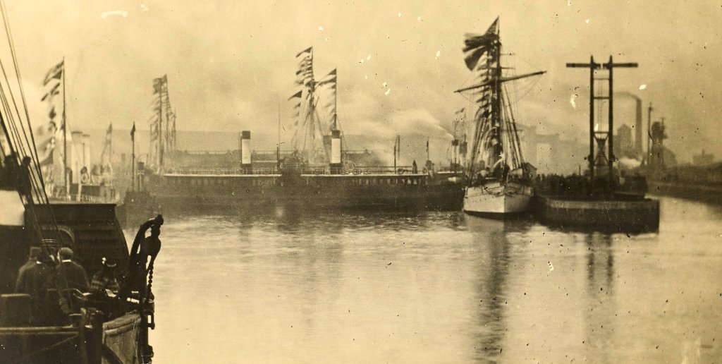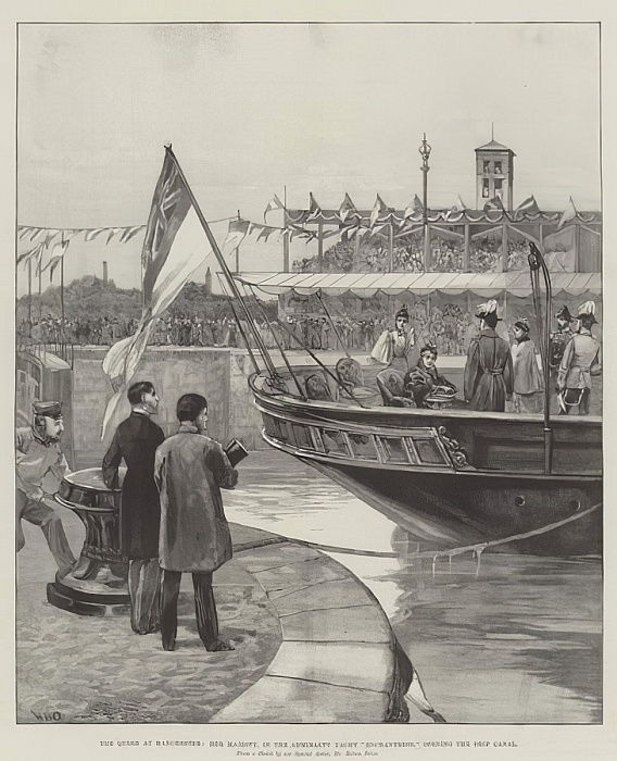 The Queen at Manchester, Her Majesty, in the Admiralty Yacht Enchantress, opening the Ship Canal, by William Heysham Overend. The author died in 1898, so this work is in the public domain in its country of origin where the copyright term is the author’s life plus 100 years or fewer.