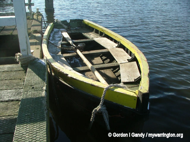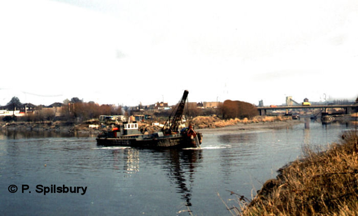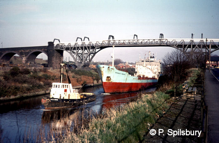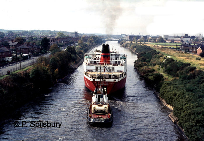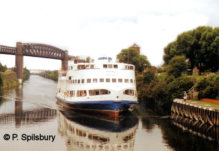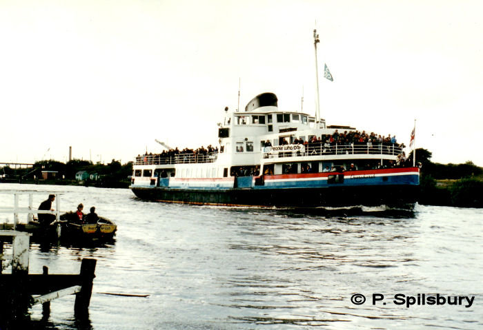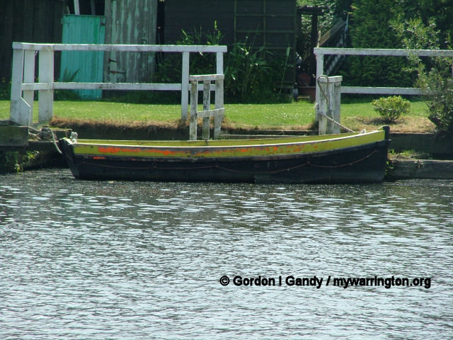 Because the route of the Manchester Ship Canal cut through an ancient right of way, the Manchester Ship Canal Company is bound by an Act of Parliament to provide the ferry service. This is in the form of a ferry, as seen in the photos below. The wooden rowing boat has since been replaced by a stainless steel version. The final photo of the set shows The Royal Iris passes by Thelwall Ferry on 2 August 1984 in a photo by Peter Spilsbury.