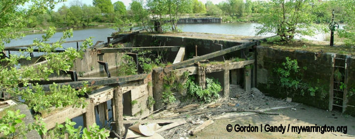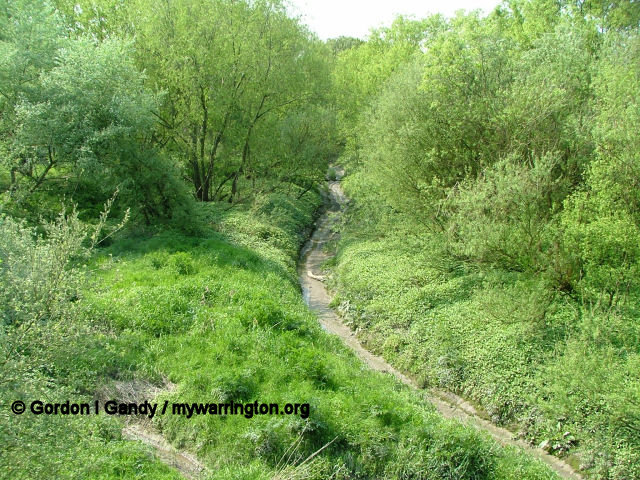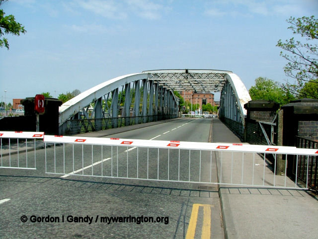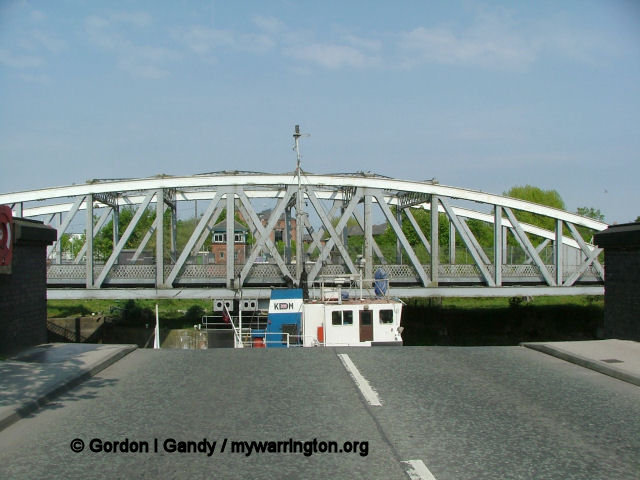 Rixton & Warburton bridge built c1894. There was a stone bridge over the old course of the River Mersey here. When the river was diverted to form part of the Manchester Ship Canal a steel bridge was built. It carries the B5159 from the A57 Manchester Road into Warburton village. The bridge still operates a toll, unless you are a pedestrian when it costs nothing. The old river bed can still be seen alongside (image, right).