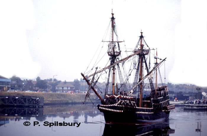 The replica Golden Hind passes through Latchford on a visit to Salford Quays on 25 October 1991. The original was the ship in which (Sir) Francis Drake circumnavigated the globe in 1577-80. Originally called the Pelican, it was renamed by Drake in mid-voyage in 1577, as he prepared to enter the straits of Magellan. It was renamed in honour of his patron, Sir Christopher Hatton (1540-91), whose armorial crest was a golden hind (the heraldic term for a female deer). Photo Copyright © P Spilsbury